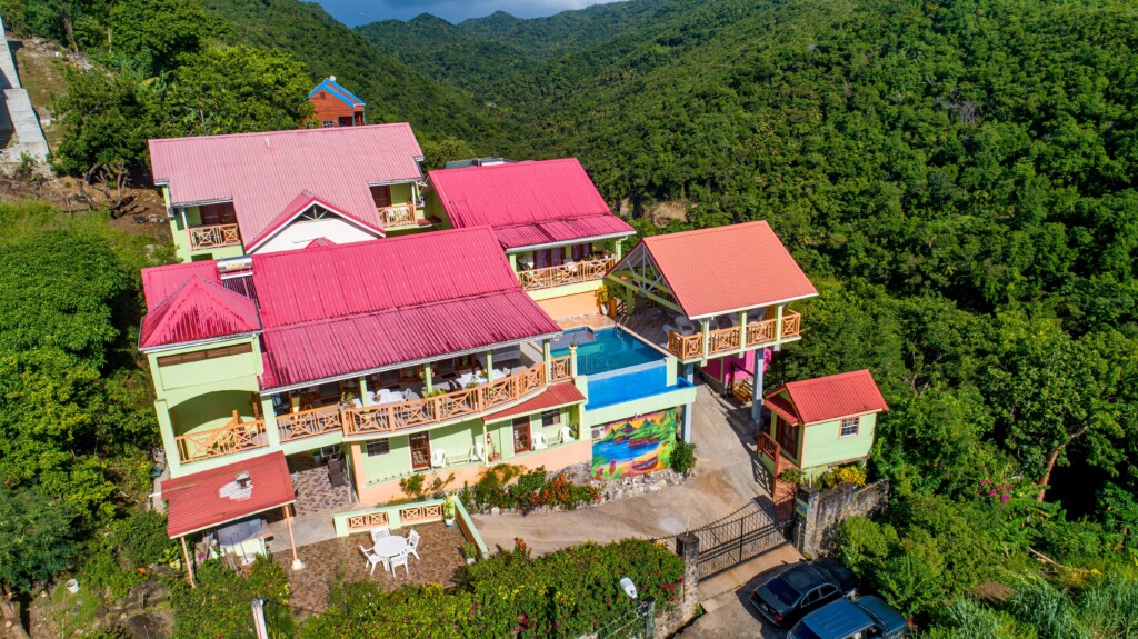 TROPICAL PARADISE VIEW is a mini hotel located on the lush hills of Au Tabor, Anse-La-Raye. We are located midway on the island’s southwest coast overlooking the Caribbean Sea. Experience the spectacular panoramic view of the fishing village and beautiful beaches on the west coast, the majestic hillside to the east and west. Midway on the west coast, you can visit the world heritage sites such as the sulfur springs, the famous pitons on the southwest, breathtaking white sand beaches, mountain hikes, and many more nature sites.